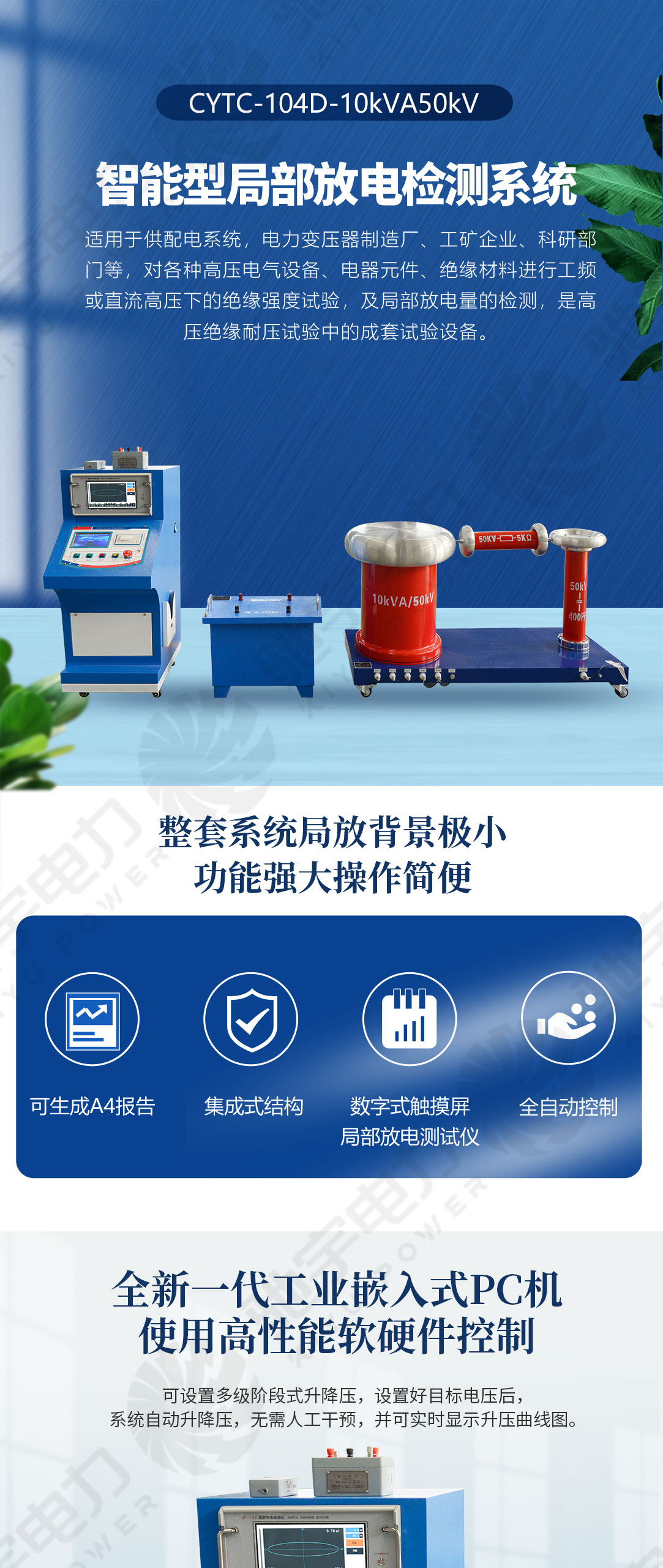 局部放電檢測系統 CYTC-104D-10kVA/50kV,適用于供配電系統,電力變壓器制造廠、工礦企業、科研部門等,對各種高壓電氣設備、電器元件、絕緣材料進行工頻或直流高壓下的絕緣強度試驗,是高壓試驗中的重要設備。巧妙的將無局放試驗裝置(變壓器控制部分)和局部放電檢測儀結為一體,外觀亮麗輕巧,使測試過程更加方便簡單。